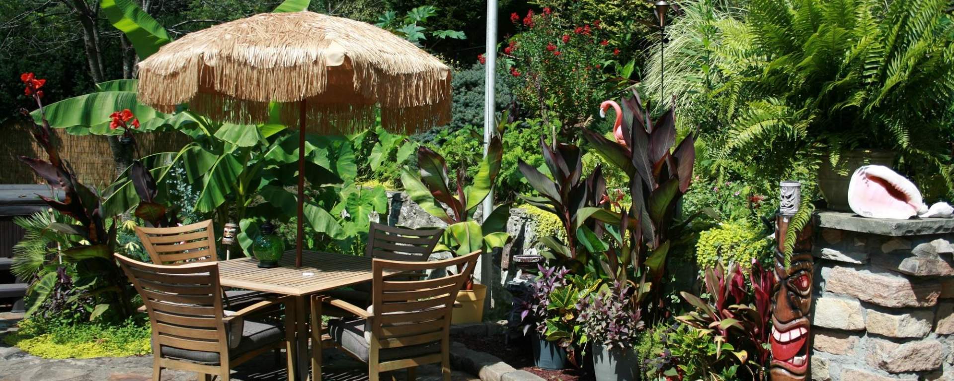He has transformed his backyard into a tropical outpost in a short three years, by replacing many of the plants with those that are usually found farther south. Some of these plants, like his banana trees, are hardy during our normal winters with mulching (though he admits last winter was rough).