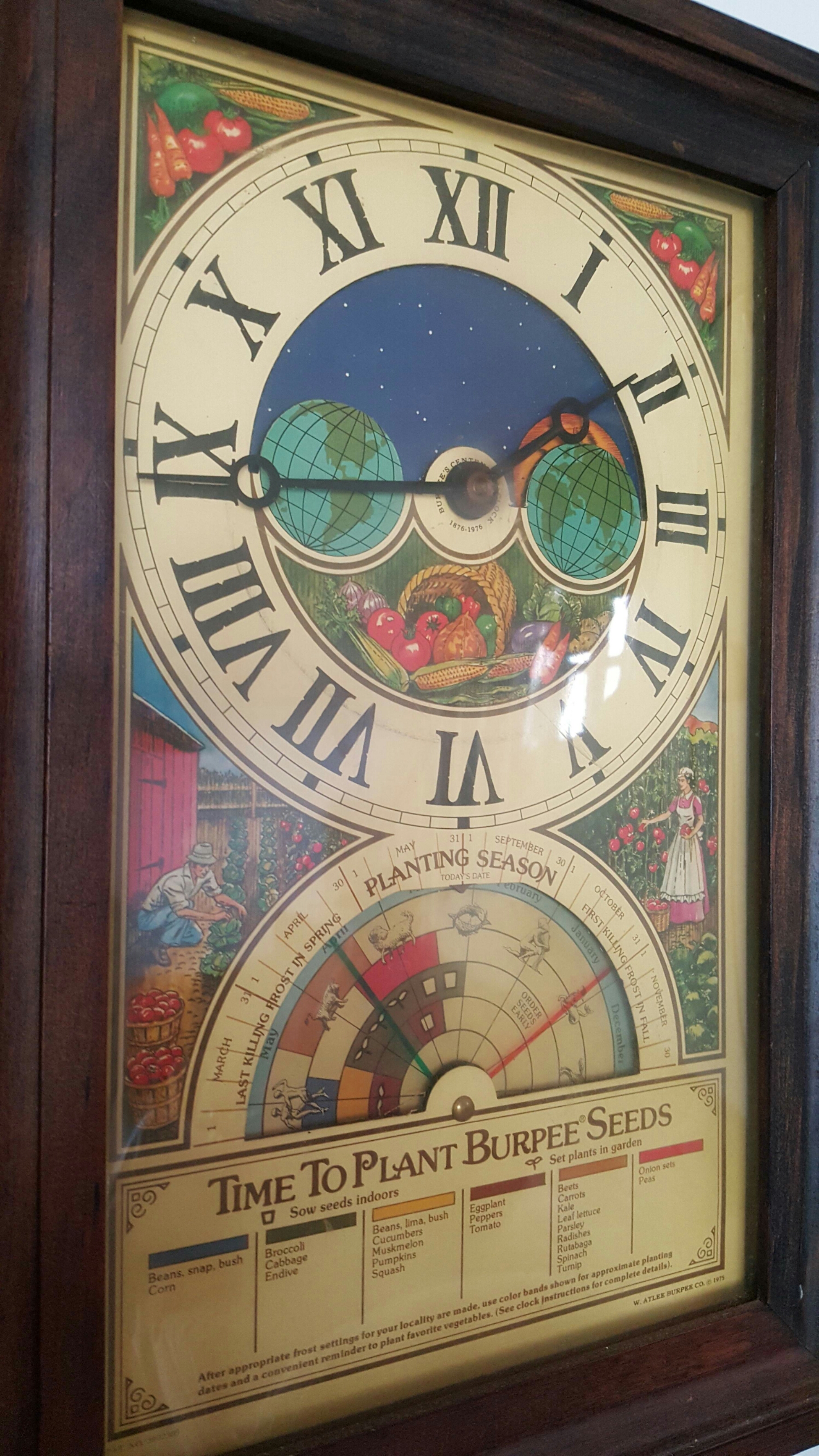 This nifty old clock that was sold by the Burpee Seed Company for its centennial in 1975 has a dial face for garden planting times. Not that I plan my garden by it, but it is a good visual reminder.