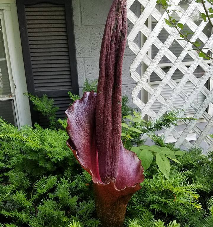 Sarah’s plant is called a Voodoo Lily (Amorphophallus konjac). Native to subtropical Asia, it isn’t all that common in the United States. It is part of the Arum family and is related to plants you might know, like Jack-in-the-Pulpit and Peace Lily.