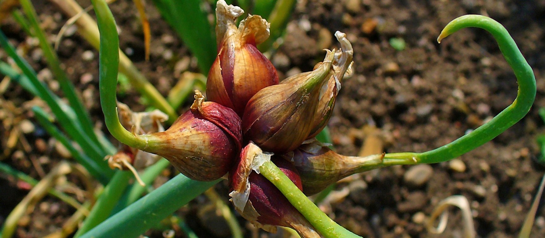 Egyptian walking onions are another perennial that can be harvested either for its bulb or as a green onion. The name comes from the bulbils that form at the top of the flower stalk.