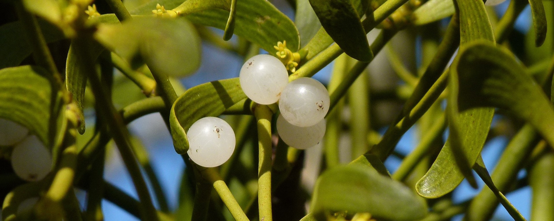 This week I thought I would talk about a plant that, while it is part of very old Christmas customs, is something that you wouldn’t really want in your own garden. That’s because, even though it is a symbol of love and even peace, it truly is a parasite … and poisonous. It has been celebrated and even worshipped for centuries, and still has a “naughty but nice” place in holiday celebrations.